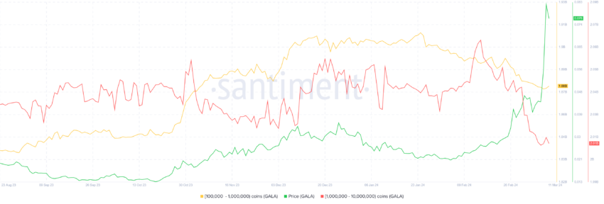 Однако шансы на такое развитие событий невысоки, посколько киты уже начали фиксировать прибыль. За последние десять дней адреса с балансами от 100 тыс. до 10 млн GALA продали более 30 млн токенов и, похоже, не собираются останавливаться.