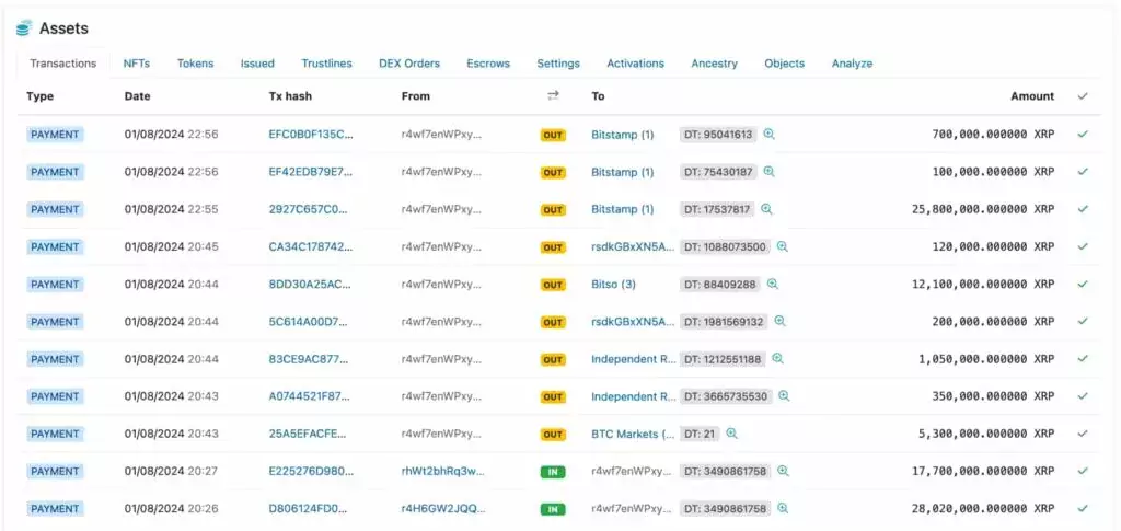 8 января r4wf7 переместил в общей сложности 45,72 млн XRP на четыре известных биржевых адреса. Bitstamp получила 26,60 млн, Bitso — 12,10 млн, Independent Reserves — 1,4 млн и BTC Markets — 5,3 млн. Интересно, что на неизвестный адрес поступили 320 000 токенов.