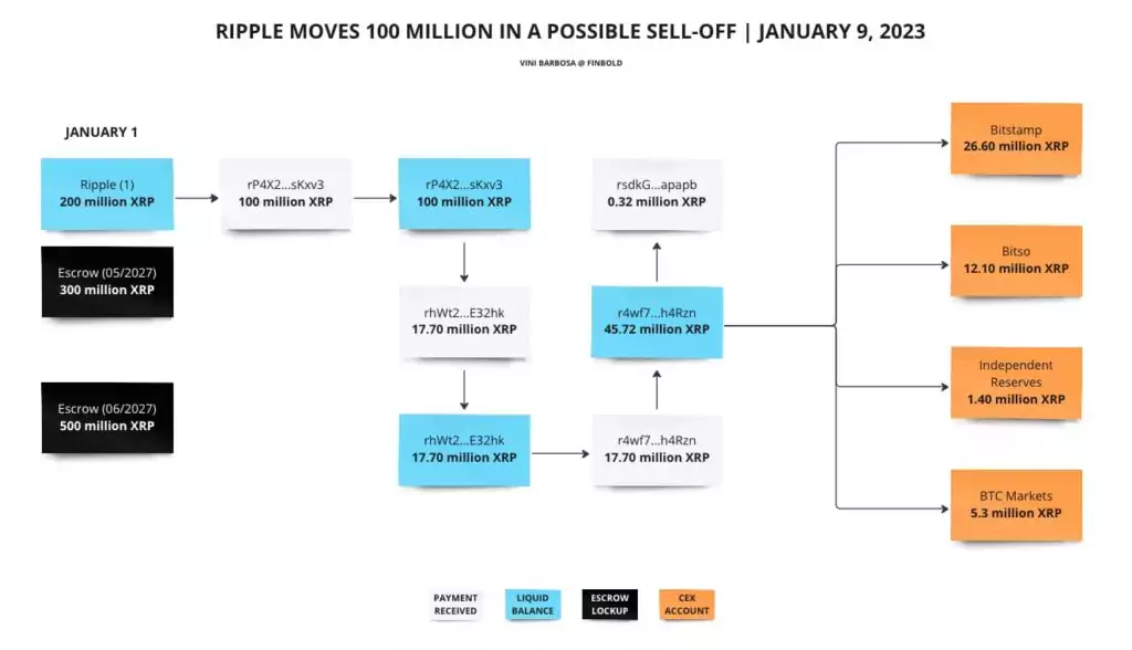 Ripple переместила 100 миллионов токенов в рамках возможной распродажи.