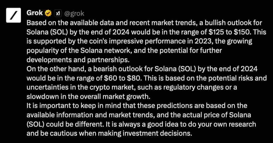 Выдающиеся результаты Solana (SOL) в 2023 году выделили её среди многих криптовалют. Чтобы получить представление о ценовой динамике SOL в 2024 году, искусственному интеллекту (ИИ) Grok, разработанному xAI Илона Маска, поручили выполнить прогноз на конец года.