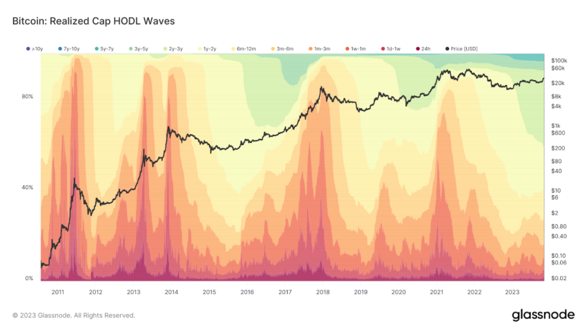 Индикатор Realized Cap HODL Waves, указывает на завершение аккумуляции. График показывает, что исторически зрелый бычий рынок характеризуется резким ростом красной и оранжевой волн. И напротив, на медвежьем рынке преобладают желтые полосы.