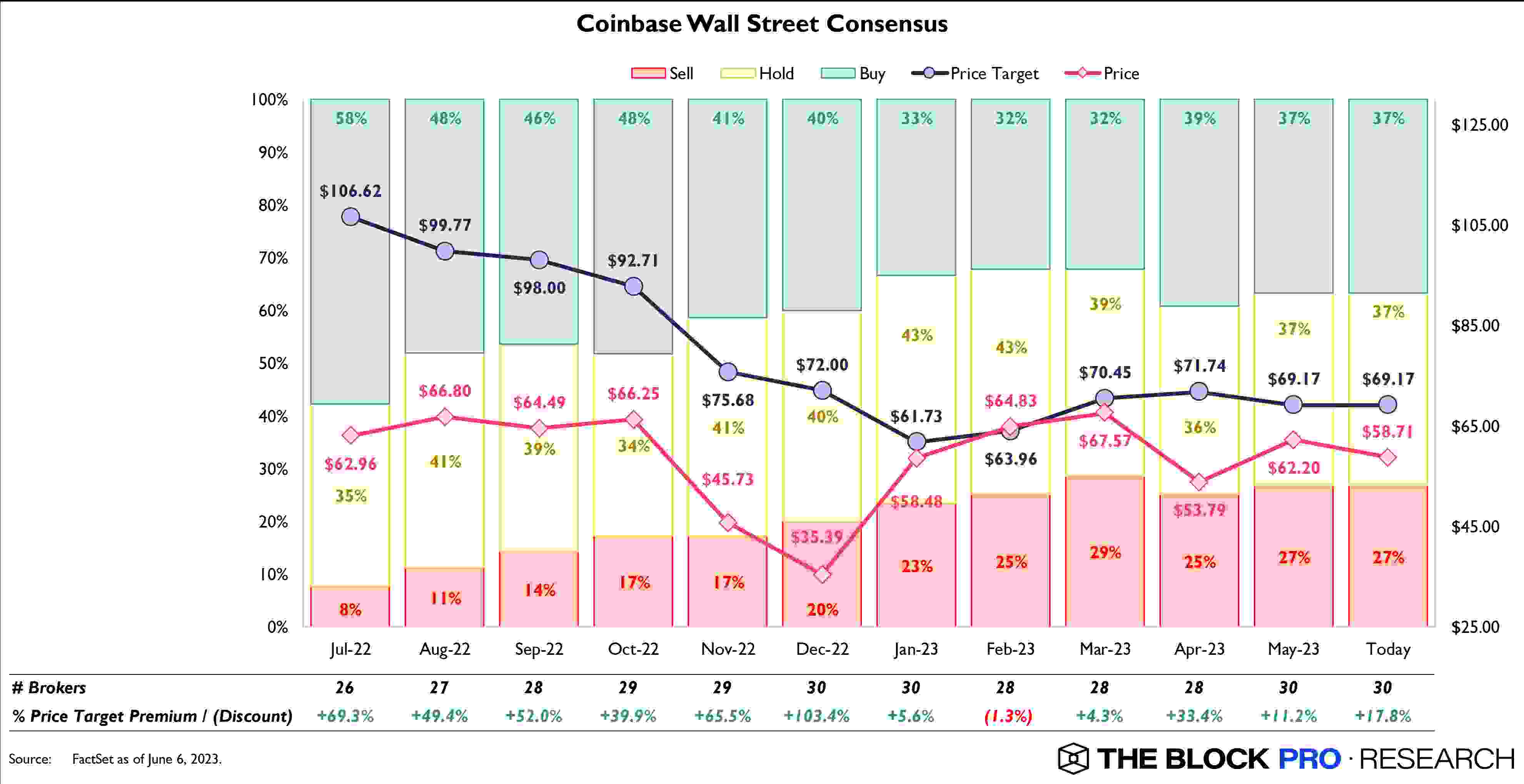 И, несмотря на иск, аналитики по-прежнему оптимистичны в отношении акций Coinbase. По данным The Block Research, средняя целевая цена COIN составляет $ 69,17, поднявшись с январских $ 61,72. Кроме того, 37% аналитиков рекомендовали покупать акции даже 5 июня, в январе их было 33%.