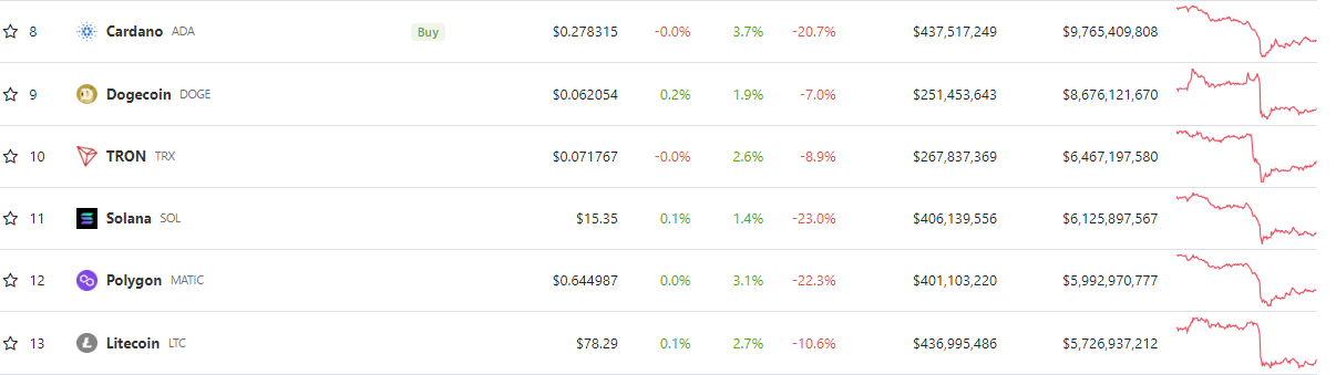 Тем временем, ADA от Cardano и Matic от Polygon показали наибольший рост за последние 24 часа. Cardano вырос на 6,11% до 0,2788 доллара, хотя за неделю потерял 25,72%. Акции Polygon выросли на 4,59% до 0,6292 доллара, но за последние семь дней снизились на 29,13%.