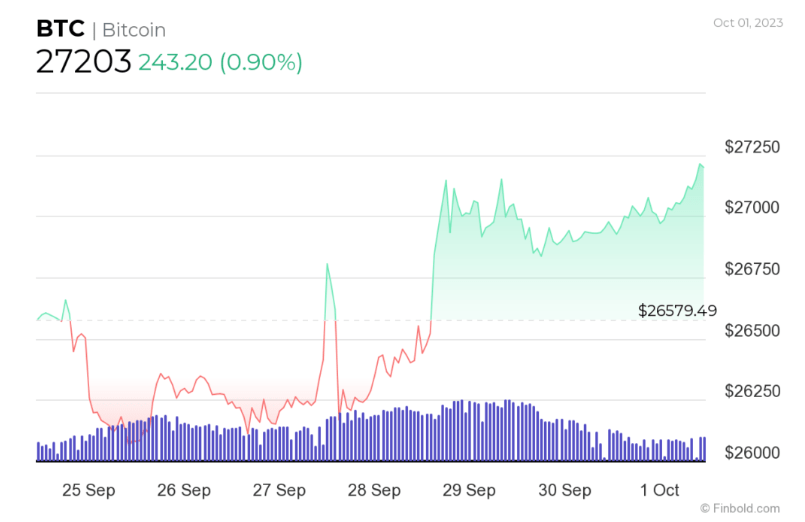 В сентябре цена биткоина вышла из периода консолидации, перевалив за уровень $27 000. 1 октября первая криптовалюта поднялась до отметки $27 203, демонстрируя дневной прирост почти в 1% и еженедельный прирост примерно в 3%.