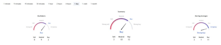 С точки зрения технического анализа, однодневные индикаторы TradingView в подавляющем большинстве благоприятствуют бычьему настрою. Сводка осцилляторов указывает на настроение «покупать» с оценками 13 и 2. Скользящие средние поддерживают сигнал «сильной покупки» с оценкой 11.