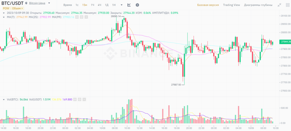 На данный момент курс Биткоина колеблется возле уровня в 28 000 долларов. Вероятнее всего, в краткосрочной перспективе цена Биткоина составит от 27 300 до 28 300 долларов.