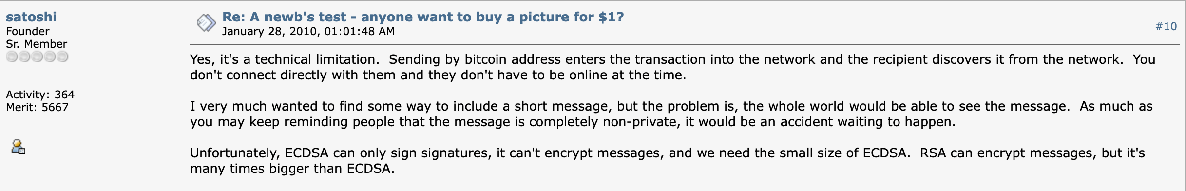 Пост Сатоши Накамото в ответ на вопрос об особенностях сети Биткоина на форуме