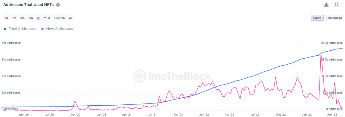 При этом в целом индустрия уникальных NFT-токенов находится не в лучшей форме. Как отмечают аналитики IntoTheBlock, общее число держателей NFT приближается к отметке в 7.5 миллиона адресов. Хотя количество новых блокчейн-адресов, которые впервые приобретают NFT, сейчас на минимуме с июня 2021 года.