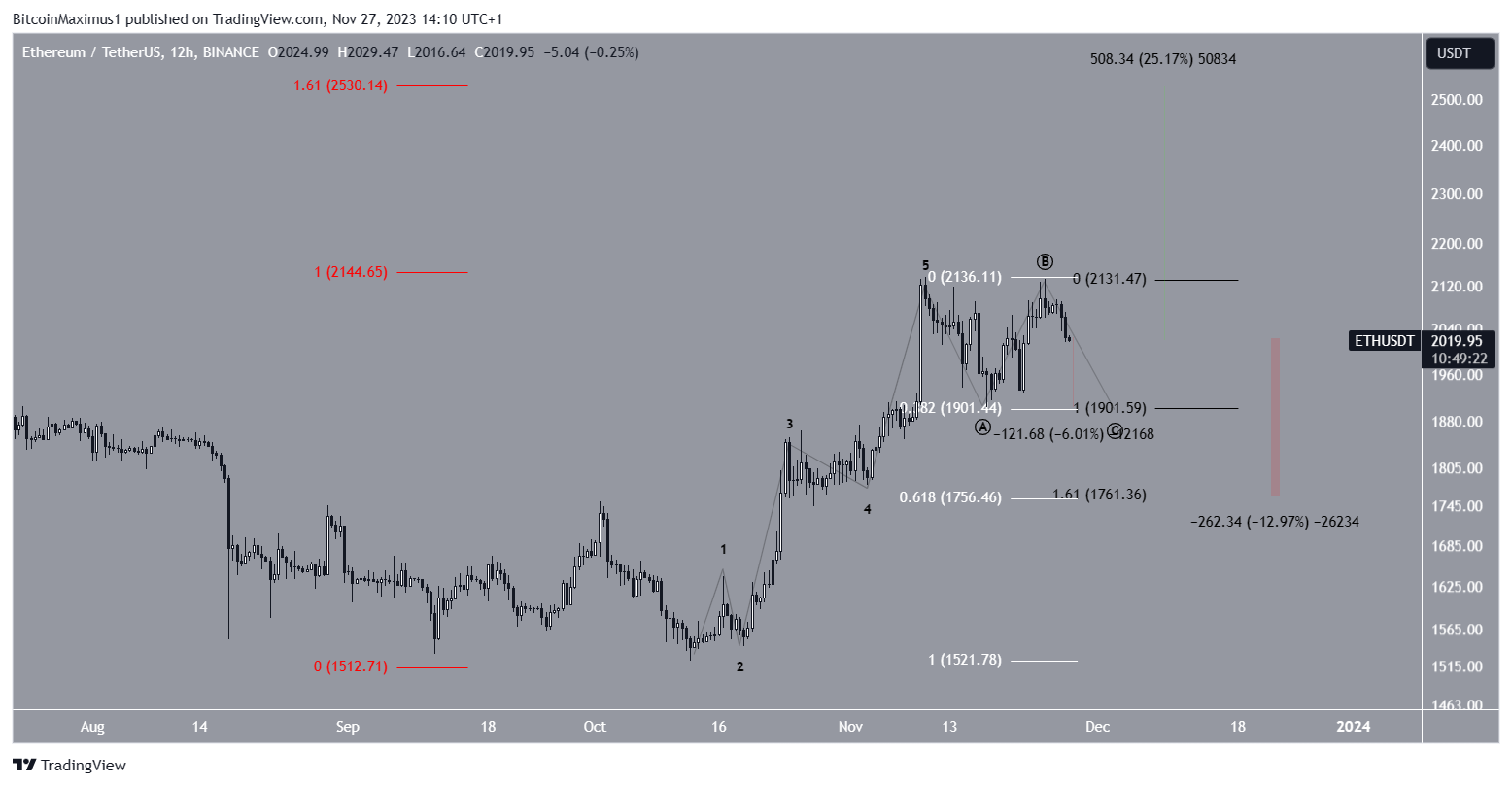 Если длина волны C превысит длину волны A в 1,61 раза, то ETH может упасть до минимума $1760, на 13% от текущей цены. Эта вторая цель будет совпадать с уровнем Фибоначчи 0,618.