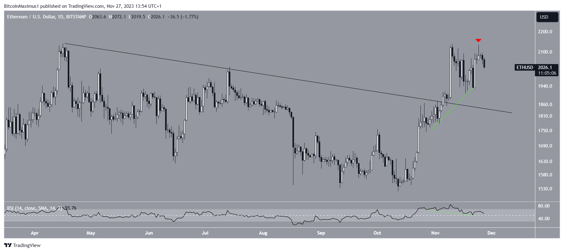 Дневной таймфрейм показывает, что в октябре Ethereum начал восходящее движение. В процессе роста цена прорвала нисходящую линию сопротивления, которая берет начало у годового максимума $2140, достигнутого 16 апреля.