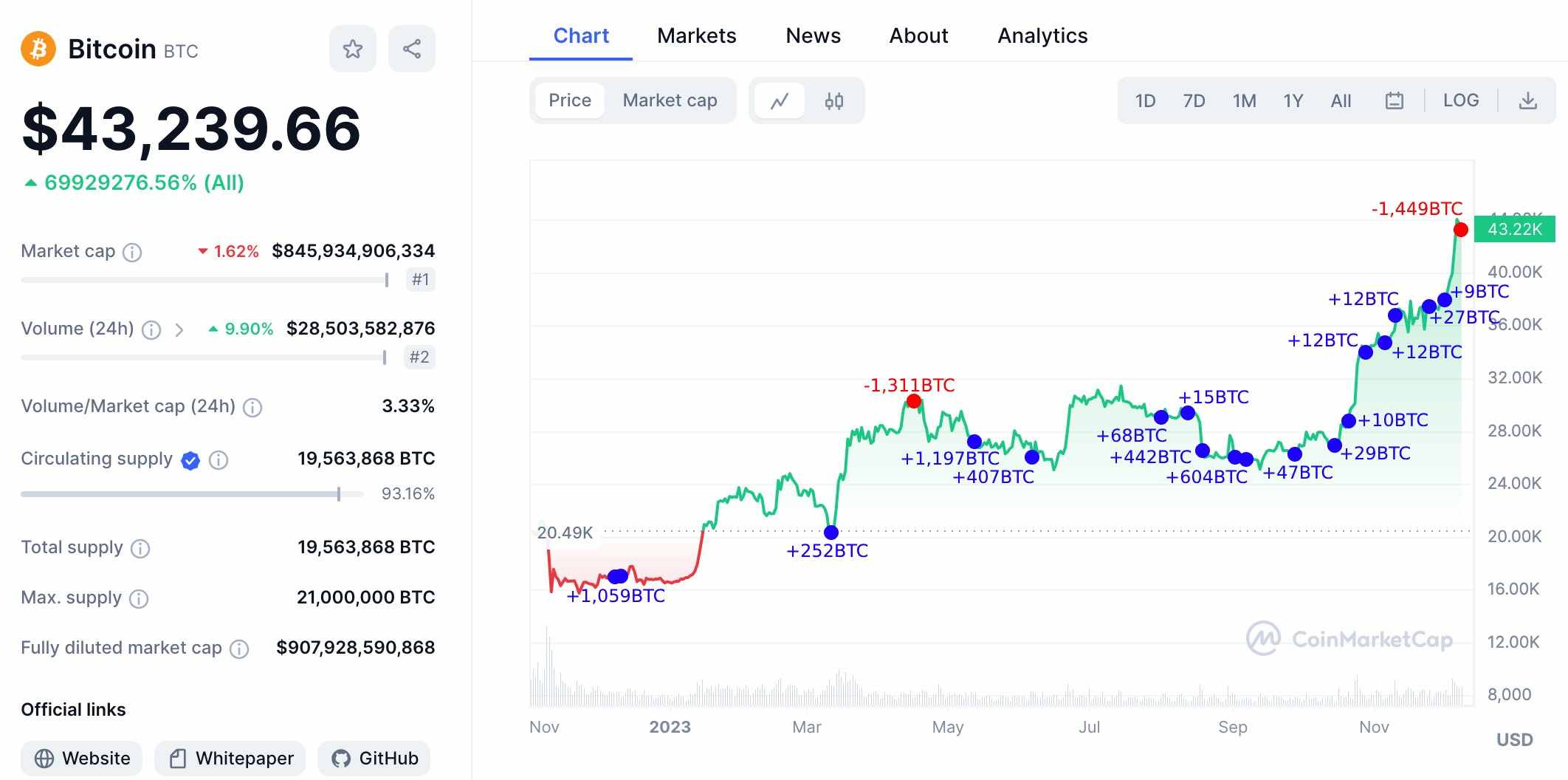 Как отмечается в аккаунте платформы аналитике блокчейнов Lookonchain, биткоин-адрес, начинающийся с 37BnFf, начал заниматься свинг-трейдингом с конца 2022 года, агрессивно покупая в течение всего года и продавая только в апреле и начале декабря.