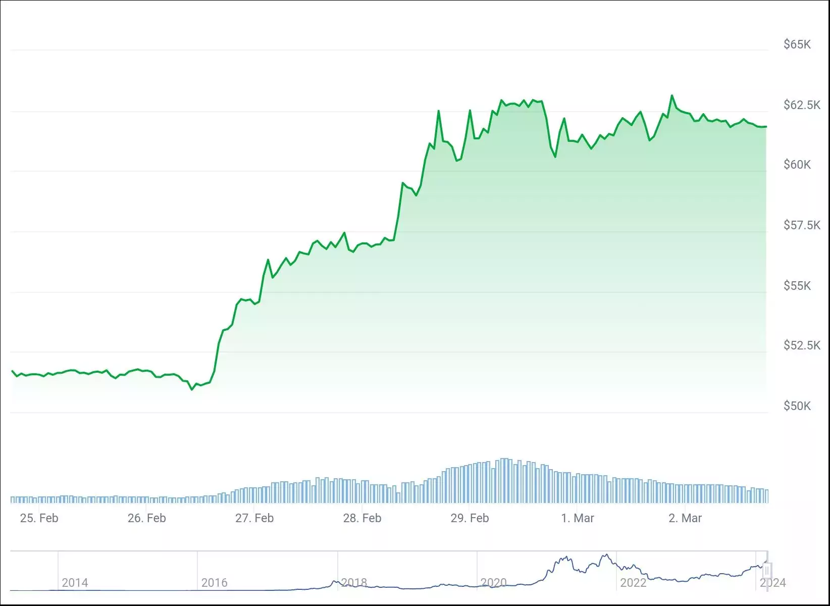 Вечером 2 марта биткоин оценивался в $62 000 с дневной потерей в 0,1%. За последние семь дней биткоин вырос на 21,6%.
