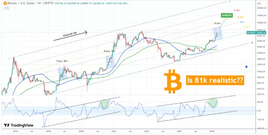 Если эта закономерность в точности повторится, аналитик рассчитал, что целевой неделей будет 1 апреля 2024 года, когда BTC может достичь $81 000. Однако, если прорыв произойдёт раньше, диапазон может варьироваться от $78 000 до $81 000.