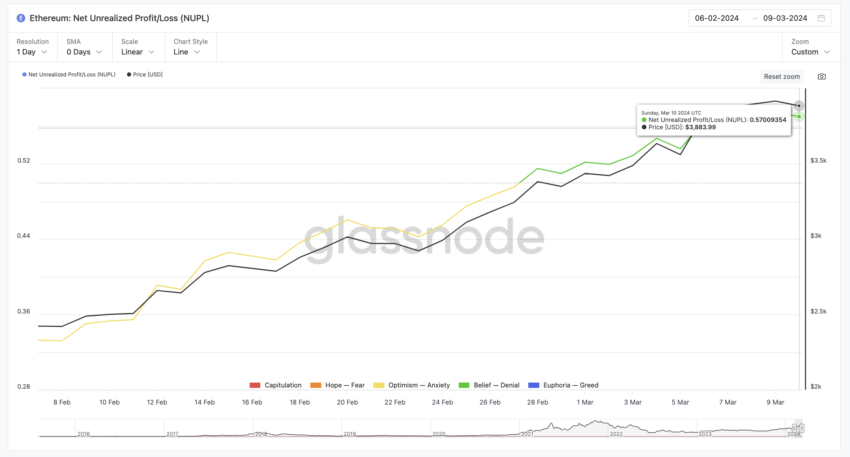 В период с 27 по 28 февраля ончейн-индикатор чистой нереализованной прибыли/убытков (NUPL) перешел из сектора «Оптимизм – Тревога» в зону «Вера – Отрицание». Этот переход означает, что большинство держателей в настоящее время находятся в прибыли и верят в Ethereum. Обычно это является признаком зреющего бычьего рынка: инвесторы уверены в своих вложениях, но не склонны к ажиотажу.