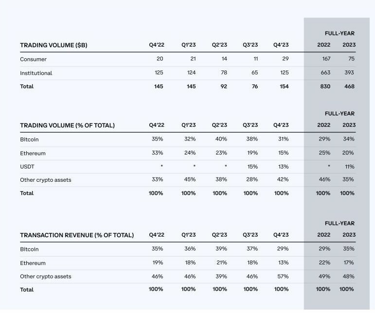 Большинство показателей Coinbase выросли на фоне восстановления рынка. Объем торгов в четвертом квартале составил $154 млрд, $125 млрд из которых приходится на институциональный рынок.