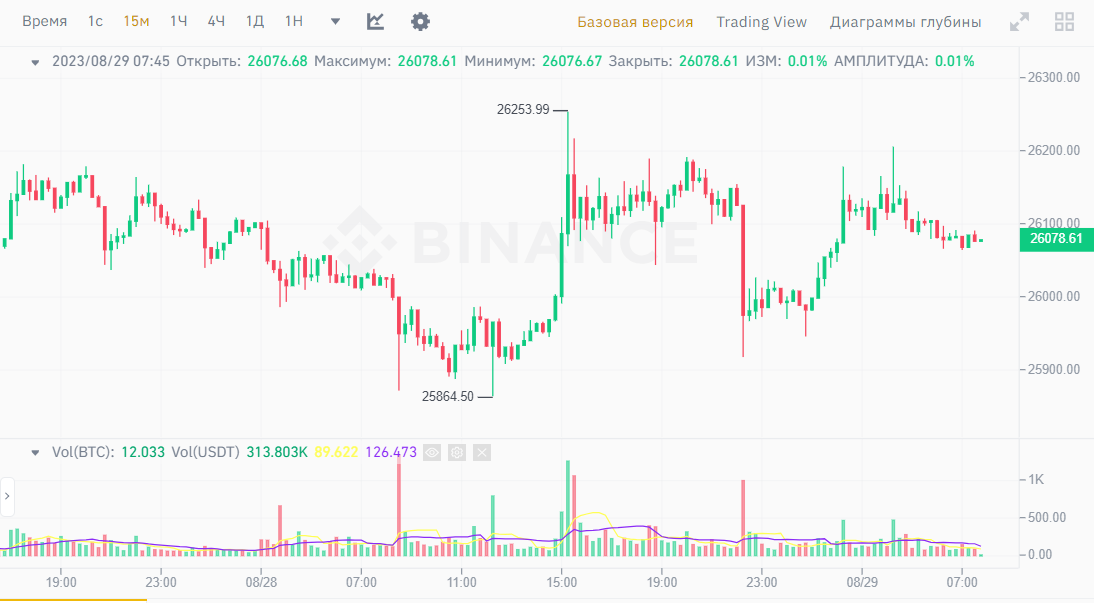 Вчера цена Биткоина сначала опустилась до минимальной отметки за сутки в 25 864 долларов, а потом восстановилась, закрепившись выше отметки в 26 000 долларов.