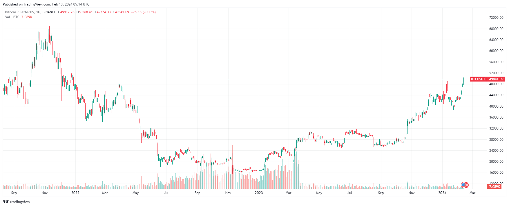 Вечером 12 февраля 2024 года биткоин дошел до $50 тыс. — уровня декабря 2021 года. Максимум BTC за 24 часа, по данным ресурса CoinMarketCap — $50 358, минимум — $47 745.