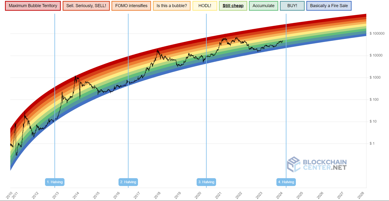 Радужный график биткоина, который показывает реакцию криптовалюты на халвинги (голубые вертикальные линии). Черной кривой отмечен курс BTC. Сама радуга показывает дорого (красная область) или дешево (синяя область) стоила монета в каждый промежуток времени. Обратите внимание на то, как после каждого халвинга BTC устремляется в красную область и обновляет абсолютный максимум стоимости. Источник: blockchaincenter