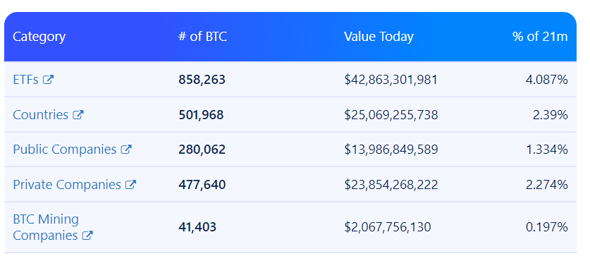 Количество биткоинов под контролем ETF, стран, публичных, частных и майнинговых компаний. Источник: buybitcoinworldwide