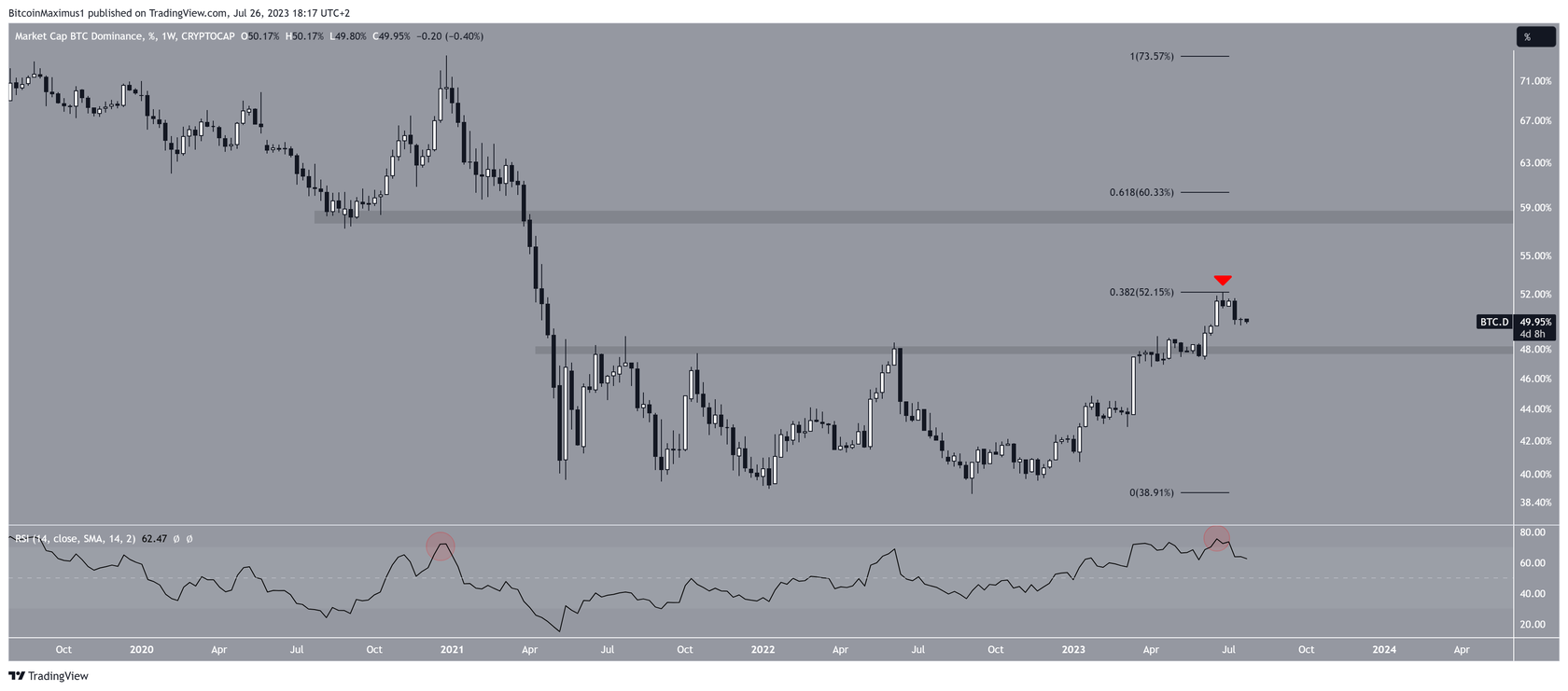 Однако этот прогноз станет недействительным, если BTCD закроет недельные торги выше 52% В этом случае более вероятным сценарием будет резкий рост к следующему важному уровню сопротивления Фибоначчи на отметке 60,33%.
