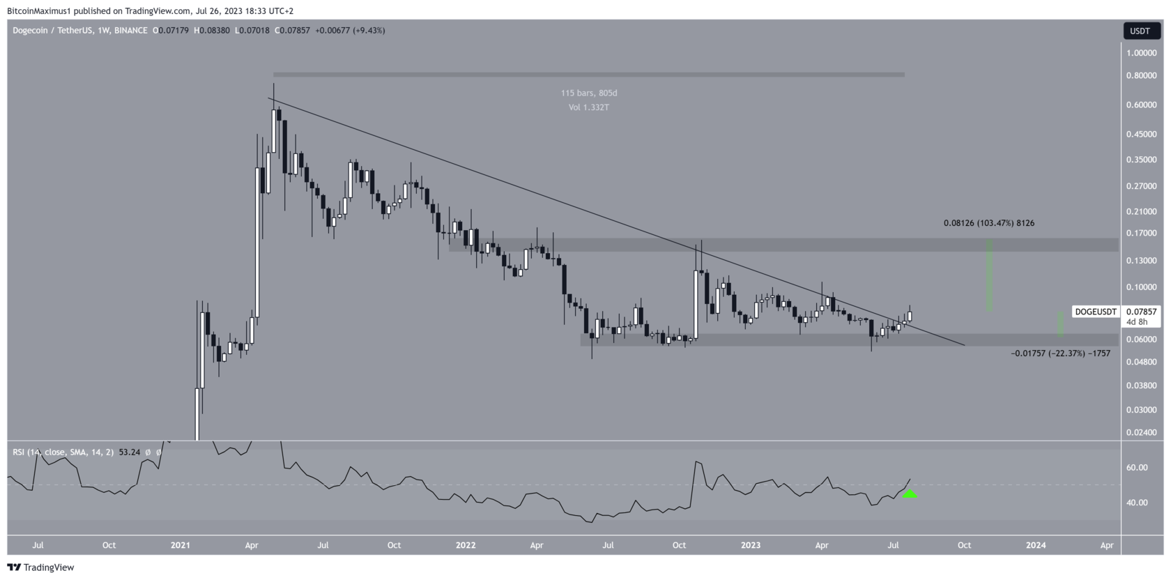 Следующая важная область сопротивления находится на $0,16, на 100% выше текущей цены. Благодаря долгосрочному бычьему прорыву и отсутствию сопротивления в ближайшей перспективе, существует вероятность того, что DOGE достигнет этого уровня.