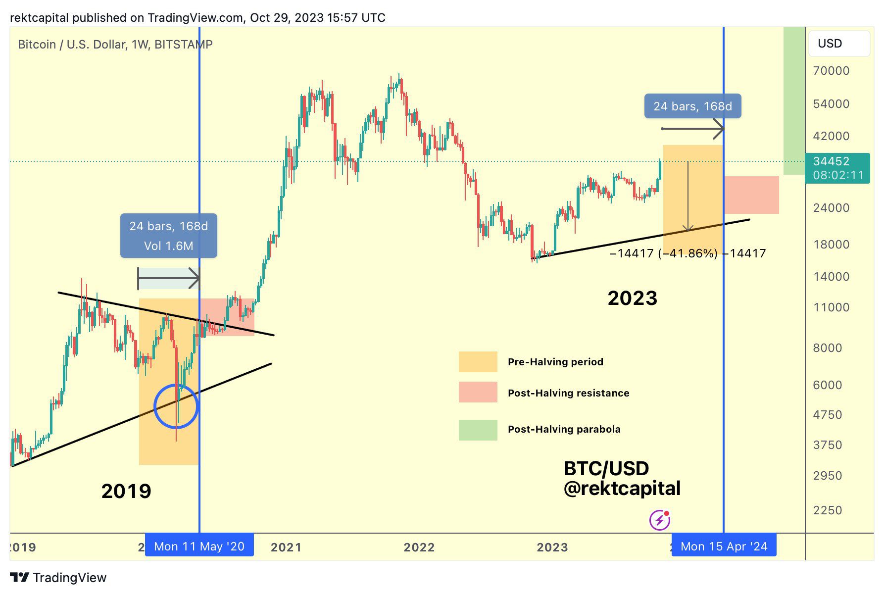 Впрочем, есть и те, кто поддерживает негативный сценарий. Например, криптотрейдер и аналитик Rekt Capital не исключает спуск BTC к $20 тыс. до халвинга. Свой прогноз биткоина он построил на сравнении текущего поведения криптовалюты с движениями монеты перед халвингом в мае 2020 года. Напомним, в преддверии события на фоне вспышки пандемии коронавируса на крипторынка случился обвал (отмечен на графике голубым кругом).