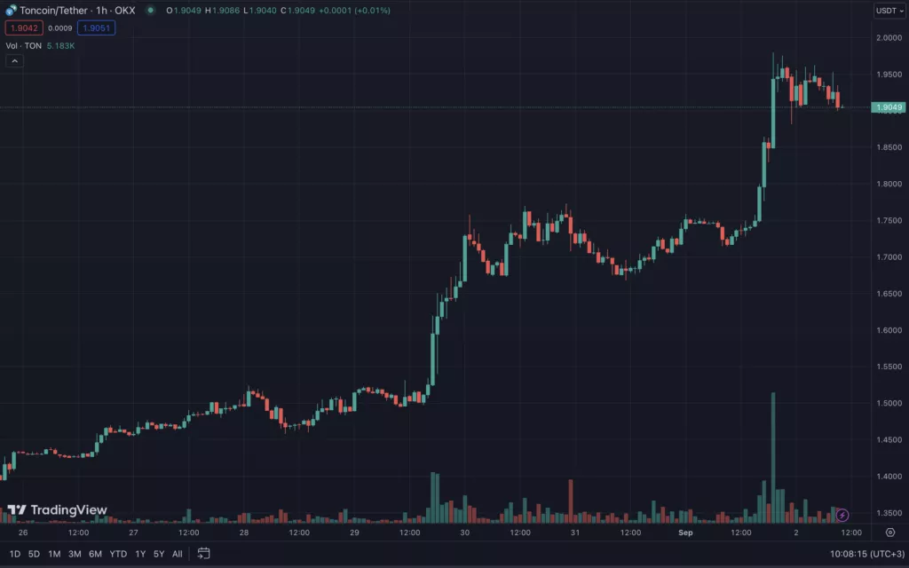 Котировки токена Toncoin (TON) приблизились к уровню $2, но не смогли преодолеть психологический рубеж. За последние сутки актив подорожал на 11%, согласно CoinGecko.