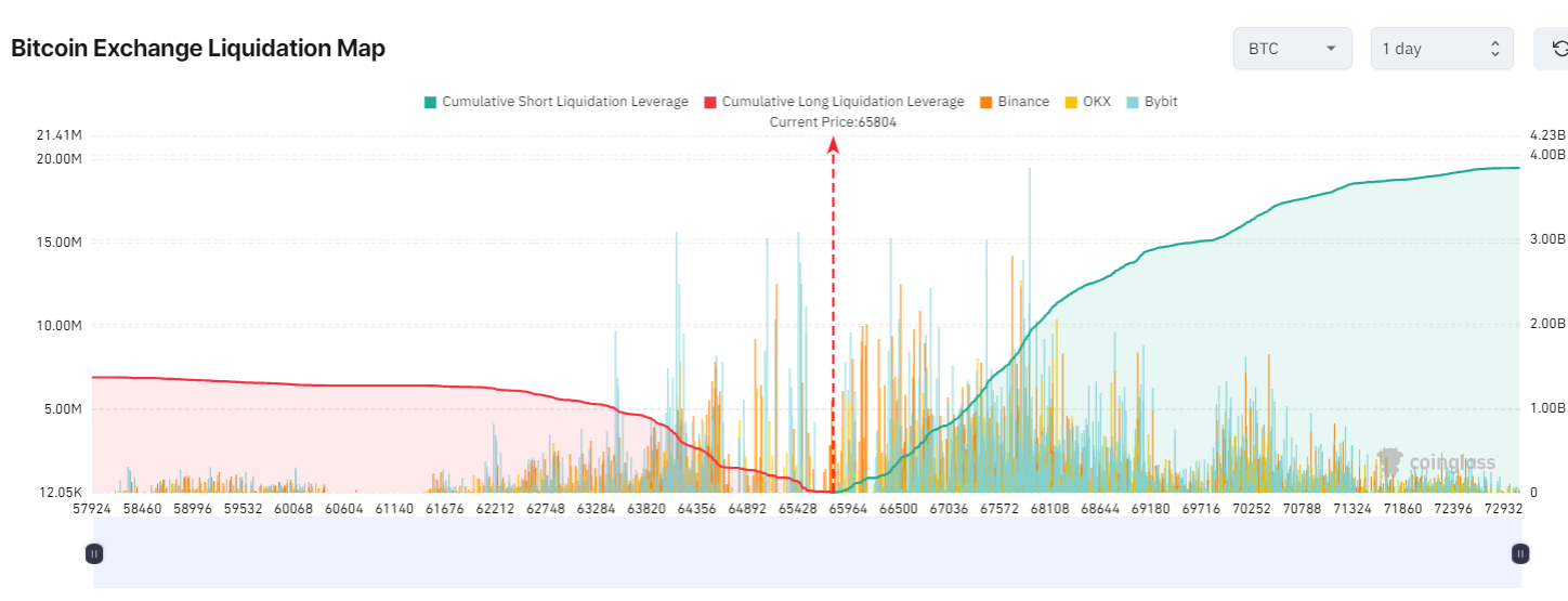 Согласно данным Coinglass, длинные позиции с привлечением заемных средств на сумму более 249 миллионов долларов будут ликвидированы на всех биржах, если цена биткоина упадет до отметки в 65 000 долларов.