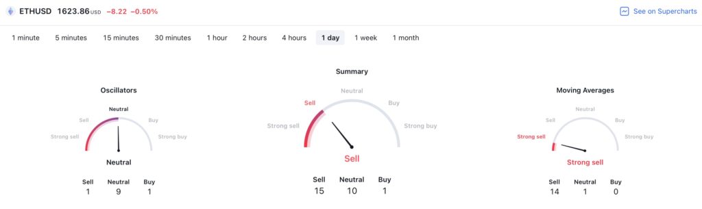 Между тем, однодневные показатели технического анализа на сайте криптоаналитики TradingView являются медвежьими. Сводный индикатор (Summary) указывает на «продажу» на уровне 15, скользящие средние (MA) говорят о «сильной продаже» на уровне 14, а осцилляторы, находящиеся в «нейтральном» положении, пребывают на отметке 9.