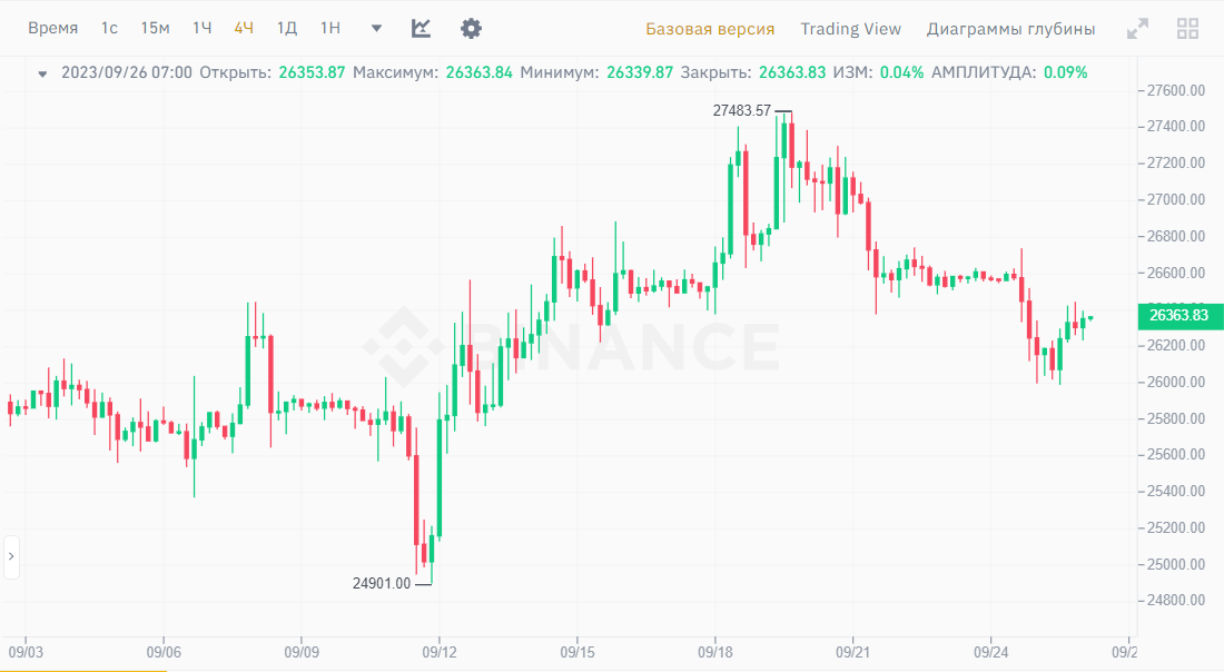 По данным CoinMarketCap, цена Биткоина на 26 сентября составила 26 357 долларов. Недельные потери составили 2%. Прогноз Биткоина остается консервативным. Крупнейшая в мире криптовалюта на выходных колебалась выше 26 500 долларов США, но рано утром в понедельник потеряла уровень поддержки.