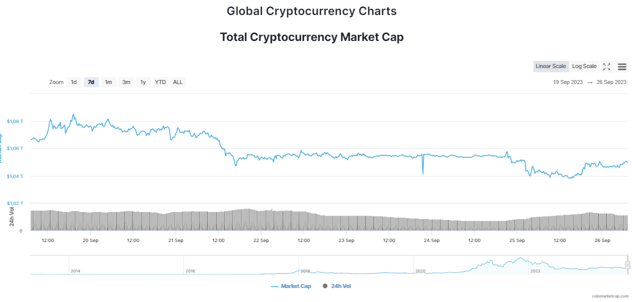 Мировые рынки криптовалют ослабли после того, как Федеральная резервная система США на своем сентябрьском заседании указала на новое повышение процентных ставок к концу года, сигнализируя, что ставки останутся высокими дольше, чем ожидалось.