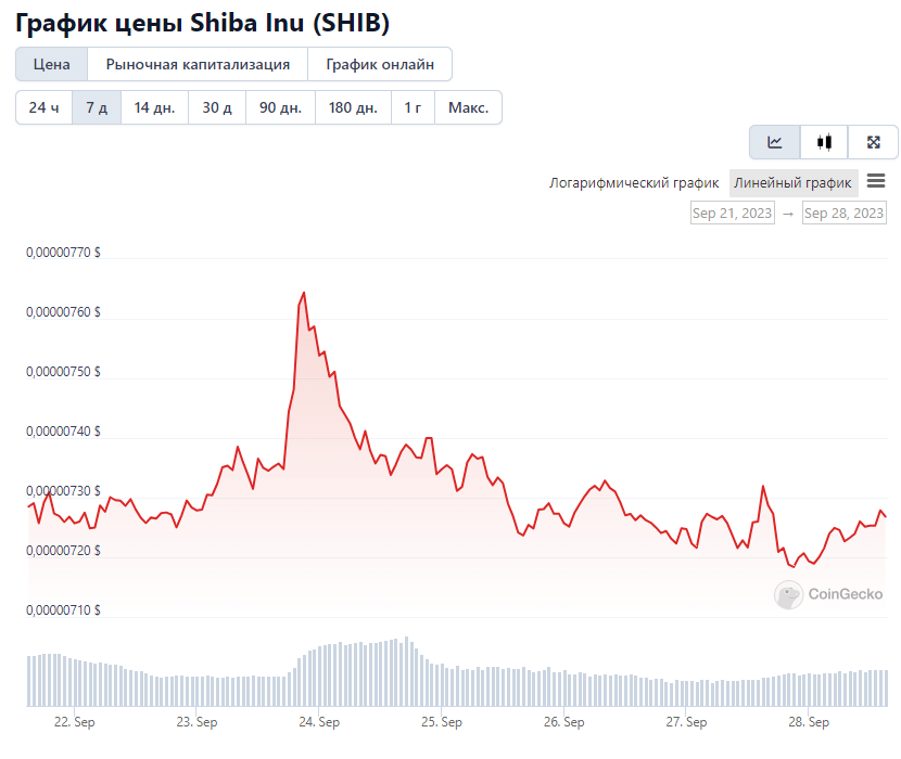 Вечером 28 сентября Shiba Inu оценивалась в $0,00000729 с дневным ростом на 0,9%, регистрируя недельное снижение на 1,54% по сравнению с предыдущими семью днями и падение на 10,55% на месячном графике.