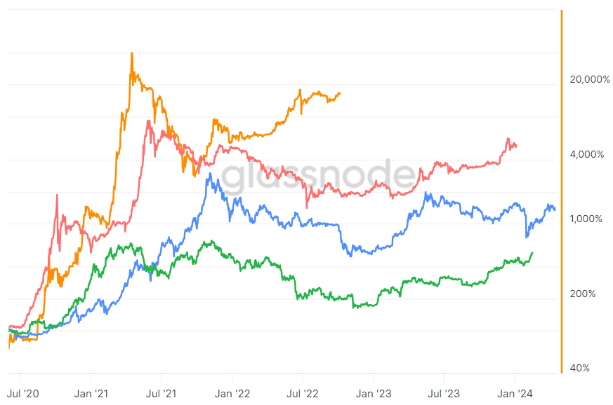 Сравнение движения BTC по циклам. Источник: Glassnode