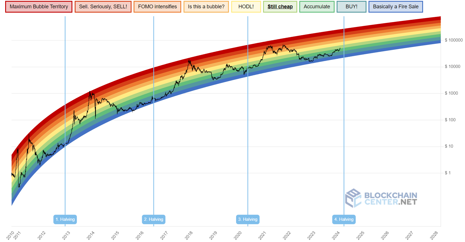 Радужный график биткоина. Вертикальными линиями обозначены халвинги, черной кривой — поведение BTC. Сама радуга помогает понять, дорого (красная зона) или дешево (синяя зона) стоила монета в каждый промежуток времени. Источник: blockchaincenter