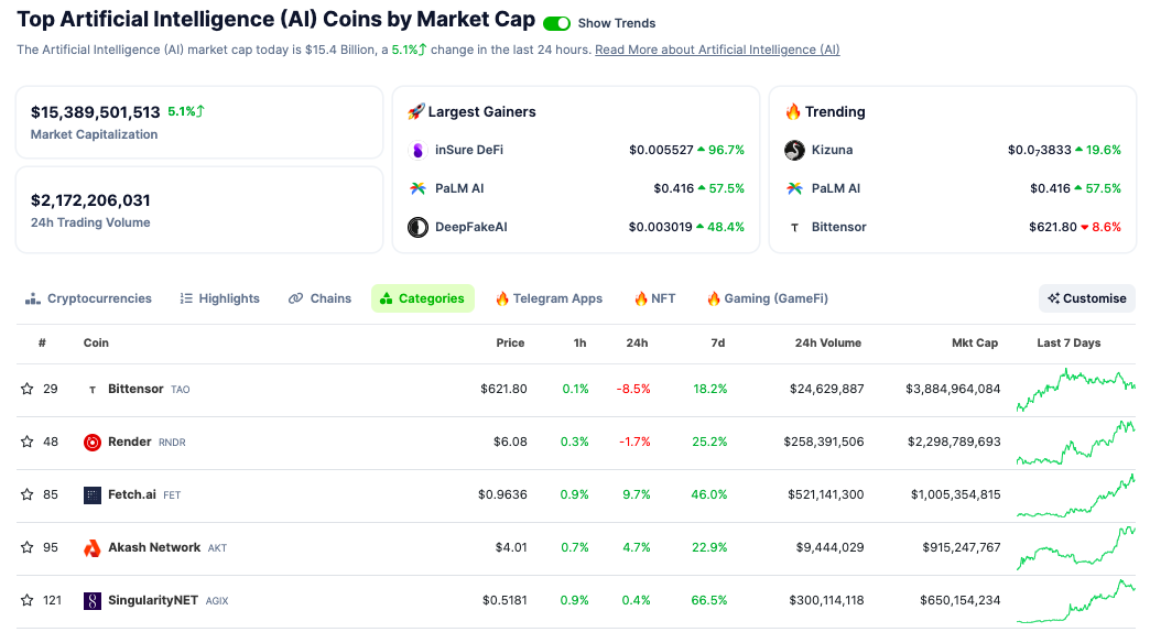 За прошедшую неделю направление ИИ-токенов зафиксировало всплеск активности, а его общая капитализация превысила $15 млрд, согласно CoinGecko.