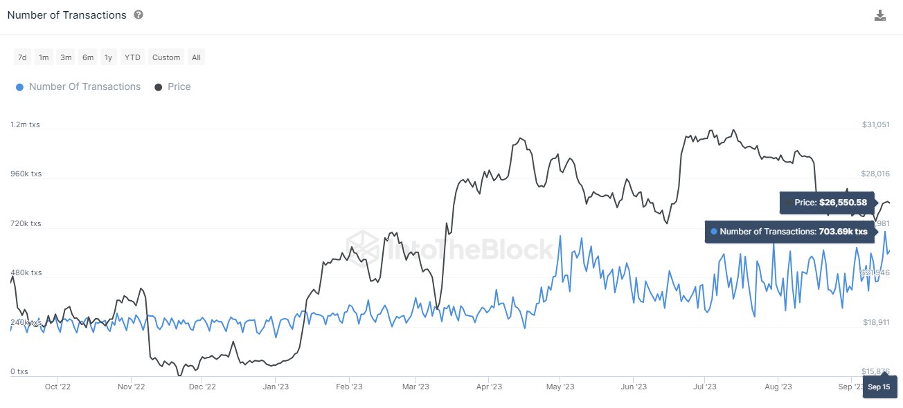 В отчете IntoTheBlock говорится, что среднесуточное число сделок в сети биткоина находится на самом высоком уровне в 2023 году.