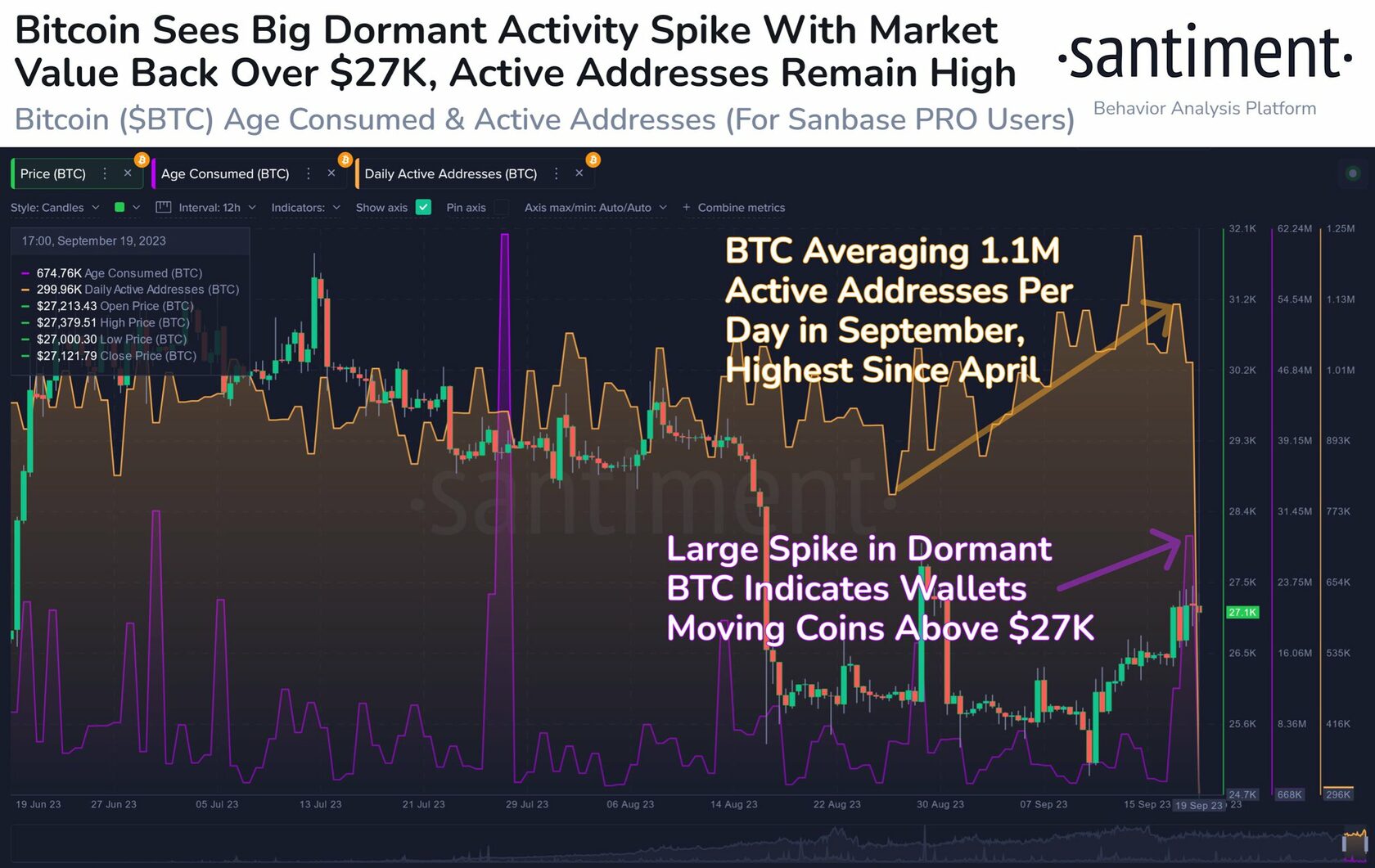 Биткоин (BTC) во вторник укрепился до $27 400. В среду криптовалюта снизилась на 0,5%, но она все еще торгуется выше $27 000. BTC прибавляет в стоимости на фоне высокой транзакционной активности на блокчейне.
