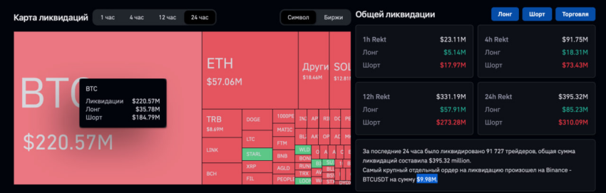 Общая сумма ликвидаций на крипторынке за последние 24 часа подобралась к 400 млн долларов. Большая часть принудительно закрытых позиций пришлась на BTC и ETH.