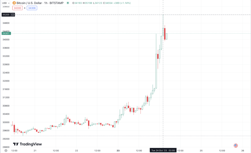 Сегодня ночью цена BTC на нескольких биржах преодолела отметку $35 000. Причина такого резкого роста связана с ожиданием одобрения спотового биткоин-ETF BlackRock и надеждами на то, что его запуск станет катализатором бычьего рынка.