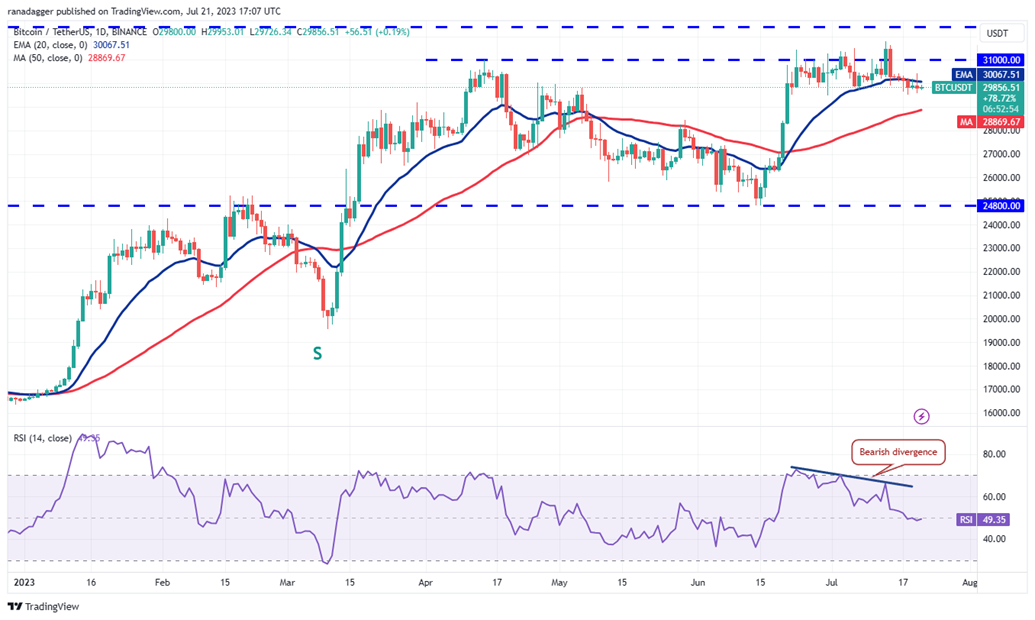 Быки подтолкнули цену выше 20-дневной EMA 20 июля, но длинный фитиль на свече показывает продажи на более высоких уровнях. Медведи попытаются укрепить свои позиции, опустив цену ниже критической поддержки на уровне 29 500 долларов.