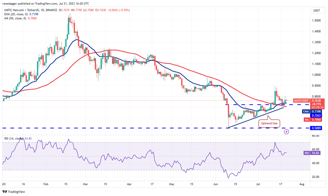 Криптовалюта поднялась от 20-дневной экспоненциальной скользящей средней (0,74 доллара) 20 июля, что указывает на то, что быки пытаются повысить цену актива.