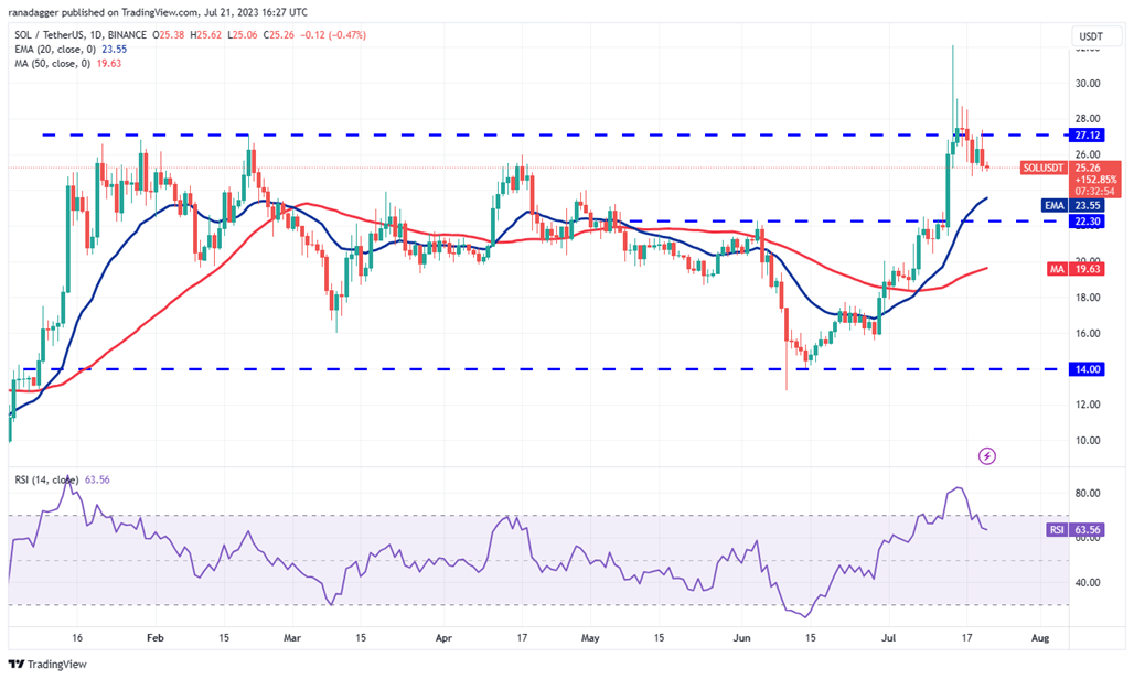 Неспособность подняться выше 27,12 доллара может подтолкнуть цену к 20-дневной EMA (23,55 доллара). Этот уровень, вероятно, станет свидетелем битвы между быками и медведями. Если цена опустится ниже 20-дневной EMA, это будет означать, что краткосрочный импульс ослаб. Это может открыть двери для более глубокой коррекции 50-дневной SMA (19,63 доллара).