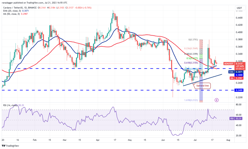У Cardano произошел отскок от 20-дневной EMA (0,31 доллара) 19 июля угас на уровне 0,33 доллара 20 июля. Это говорит о том, что медведи продают на ралли.
