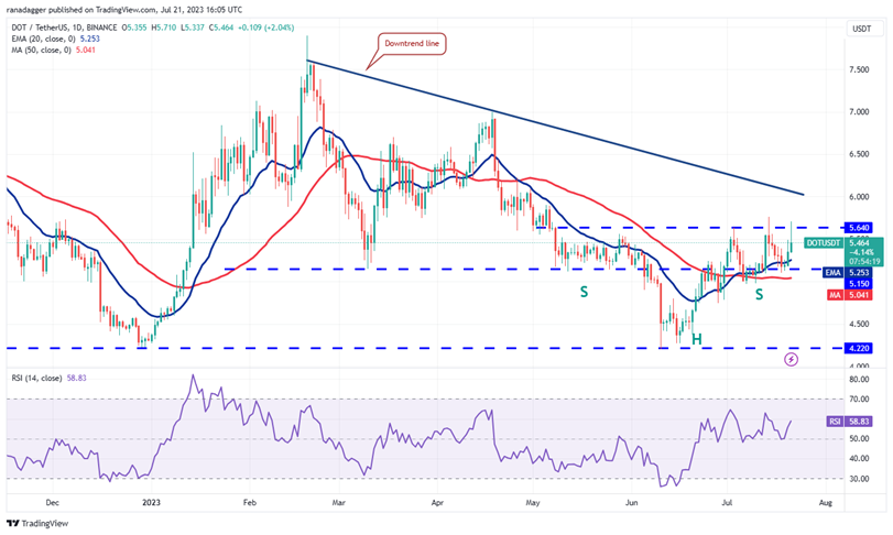 Длинный фитиль на свече от 21 июля показывает, что медведи агрессивно продают ралли до 5,64 доллара. Это говорит, что пара DOT/USDT может еще некоторое время оставаться в диапазоне между 5,15 и 5,64 доллара.