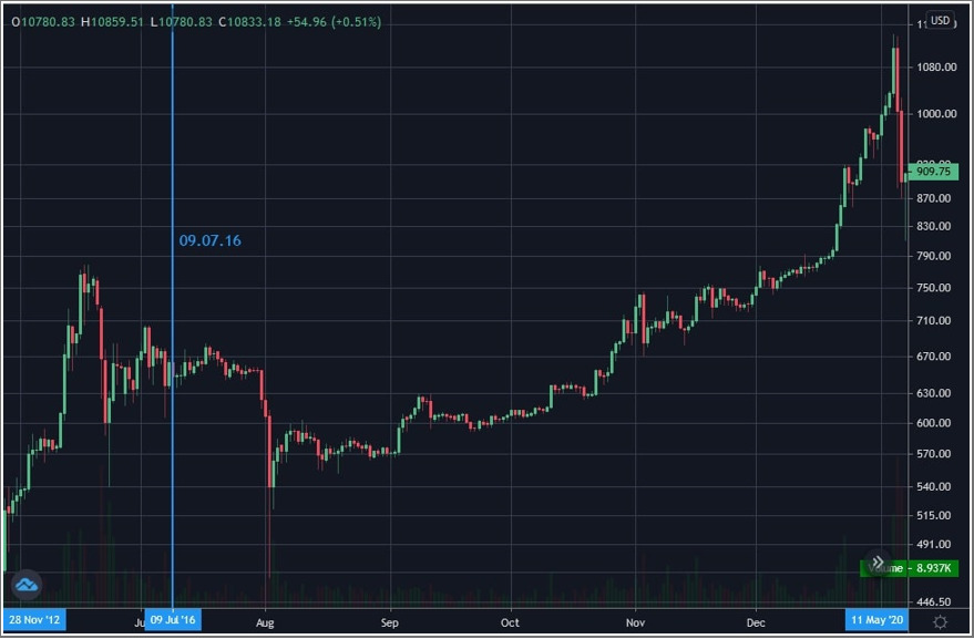 Второй халвинг произошел 9 июля 2016 года. Криптосообщество с нетерпением ждало этой даты. Эти ожидания в сочетании с резким ростом известности и признания Биткойна привели к заметному росту цен, который начался в конце мая, за полтора месяца до халвинга. Однако в середине июня произошла коррекция, и вскоре после самого халвинга цена вновь упала, достигнув своего локального минимума майских уровней.