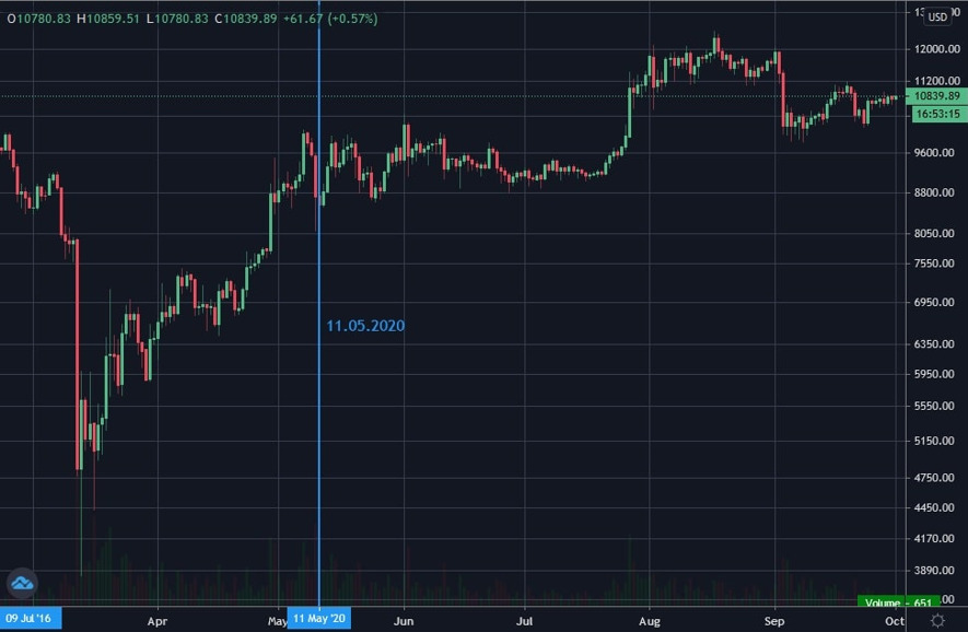 Дата 11 мая 2020 г. Номер блока 630 000 Награда за блок, BTC 6,25 BTC создается за день 900 Цена BTC на старте $8740 Цена BTC через 100 дней 11 950 долларов США