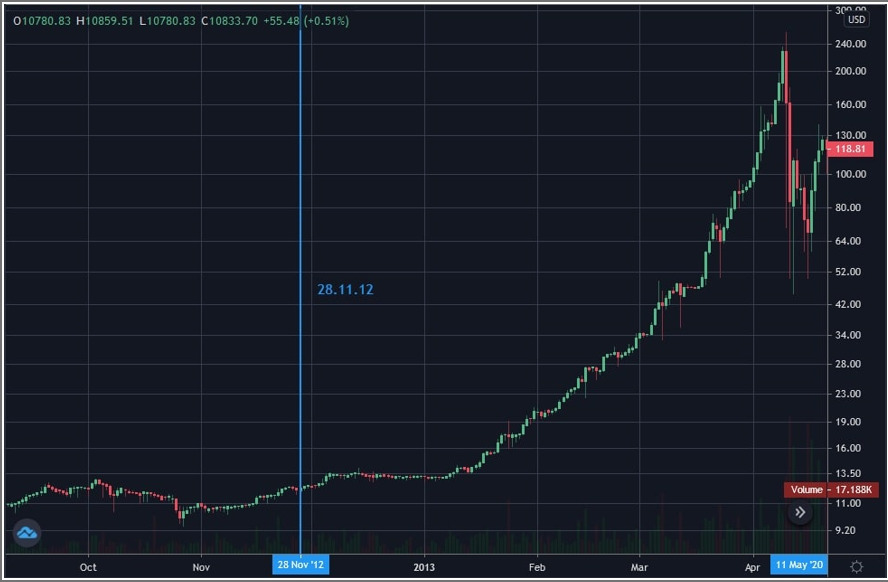 - В период между первым и вторым халвингами начальная стоимость BTC составляла примерно 12 долларов. Тем не менее, он резко вырос до более чем 1200 долларов, что соответствует умопомрачительному увеличению на 10 000%.