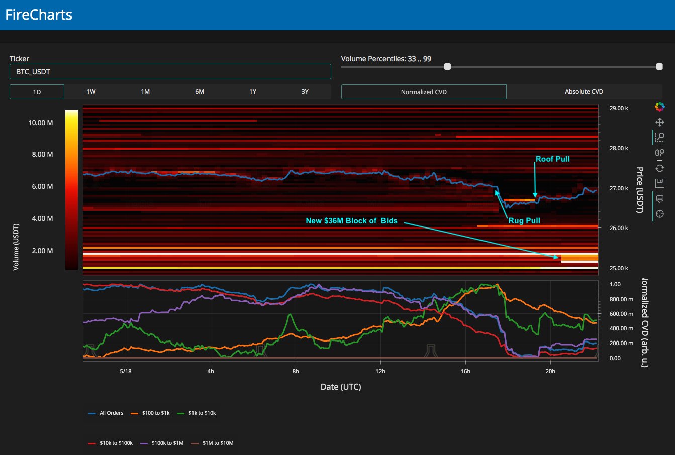 “Когда цена начала падать, лестница заявок была выстроена, и цена двинулась к предыдущей поддержке ~$26.5k, но стена продаж была быстро установлена, чтобы подавить цену.”