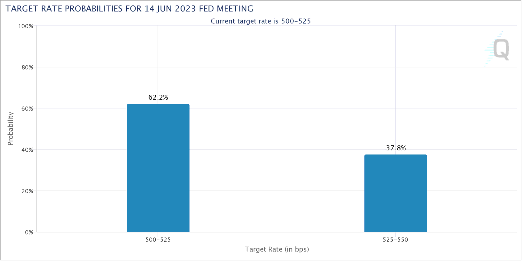 По данным инструмента cme Group's FedWatch Tool, вероятность того, что ФРС приостановит цикл повышения ставок в следующем месяце, которая в какой-то момент превышала 95%, в этот день составила всего 62%.