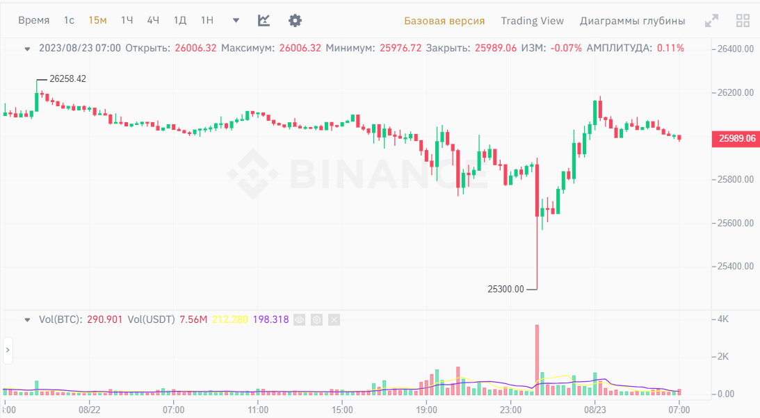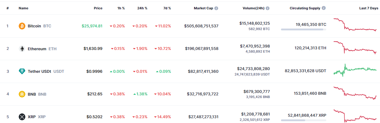 Биткоин вчера торговался преимущественно около уровня в 26 000 долларов. Однако к концу дня под давлением негативных факторов криптовалюта обновила двухмесячный минимум у отметки 25 300 долларов США. Эфириум снизился на 1,91% во время торгов до 1630 долларов США и упал на 9,57% за последнюю неделю. Прогноз Биткоина остается консервативным.